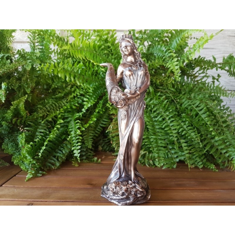 Fortuna soška. Římská bohyně štěstí, náhody a úspěchu. Se zavázanými oči symbolizuje spravedlnost. Výška sošky 30 cm, resin.