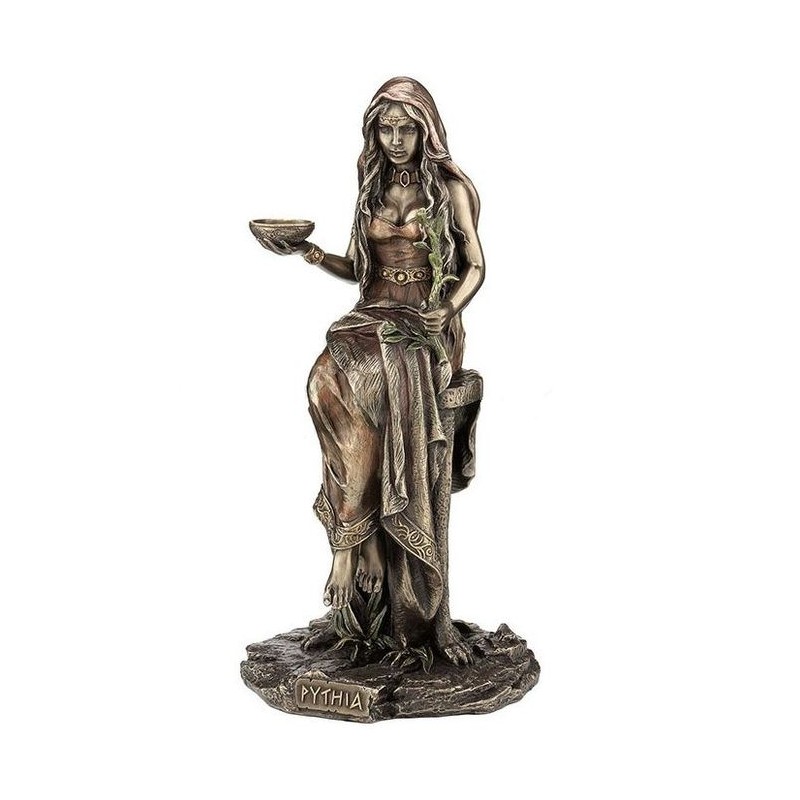 Pýthia, řecká věštkyně z Delf. Soška slavné věštkyně z Apollónova chrámu. Sedící Pýthia, soška 28 cm. 1,1 kg. Resin s bronzovým povrchem.