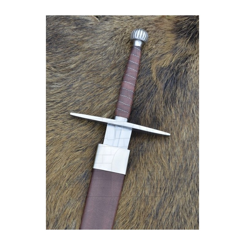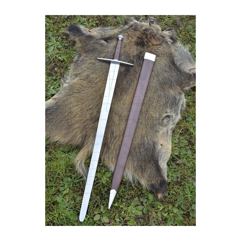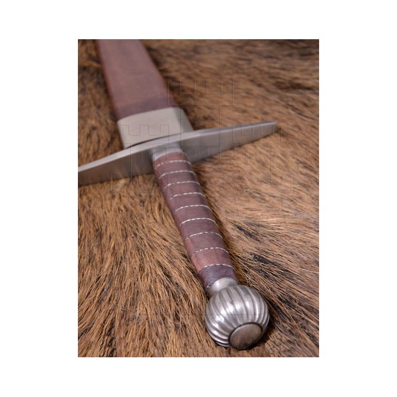 Bastard Meč Středověký Funkční 117 cm. Vyvážený meč pro šerm. Uhlíková ocel EN-45. Tvrdost 48-50 HRC. Dřevěná pochva potažená kůží.