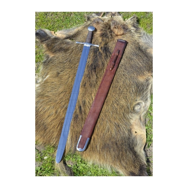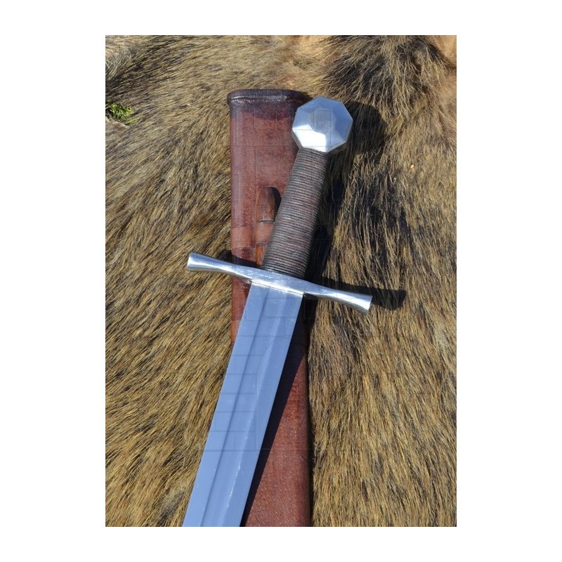 Meč křižácký funkční oktagonální hlavice. Hnědá kožená pochva. Meč na historický šerm a trénink. Jednoruční středověký meč. Délka meče: 96 cm.