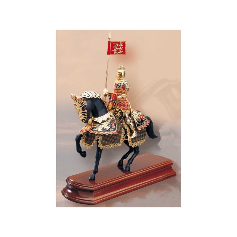 Soška prince v plné zbroji se štítem, který nese erb Anglie a s praporcem se třemi lvy.