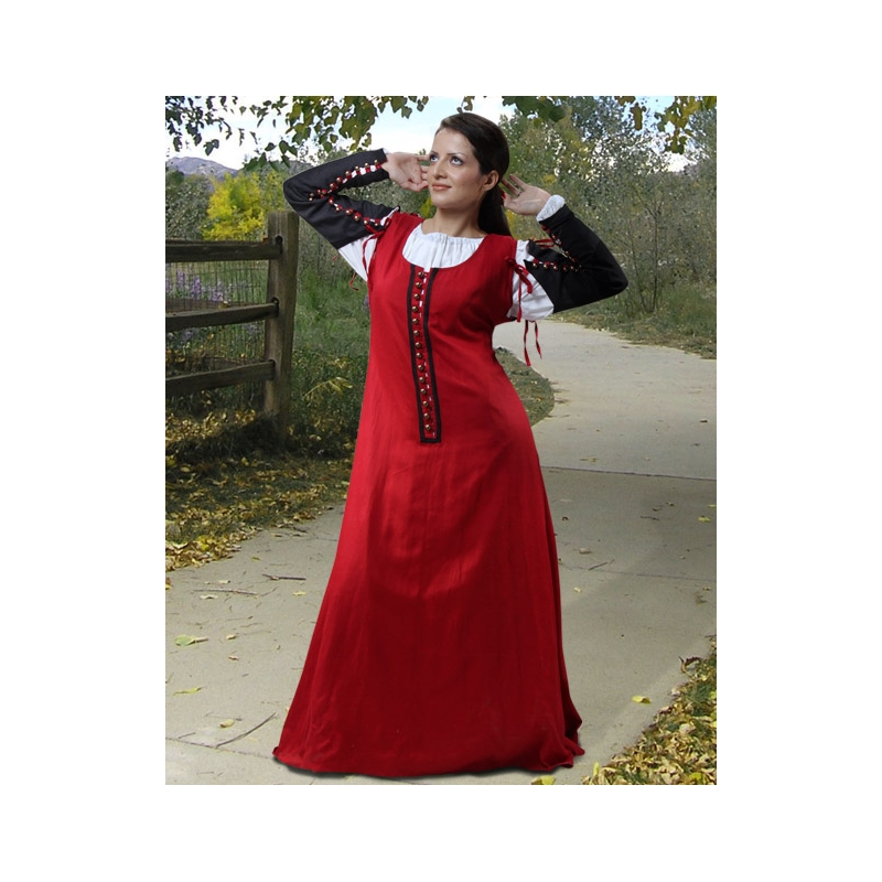 Středověké Šaty Adora. Červený středověký kostým pro dámy. Odepínatelné rukávy. 15 knoflíků na šatech, 18 knoflíků na rukávech. Kostým princezny nebo šlechtičny.