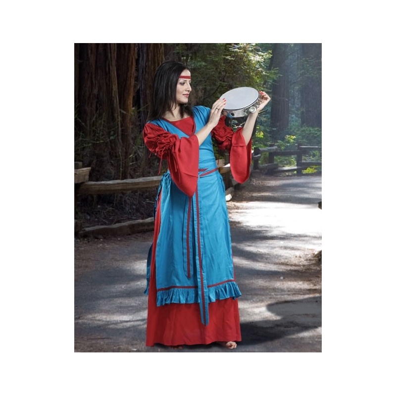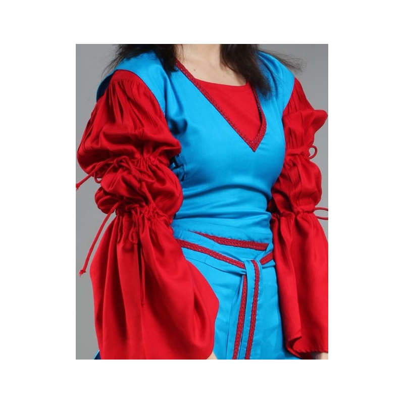 Středověký kostým Gloriana. Středověký kostým s páskem. Modré šaty a červená košile. Kompletní historický kostým.