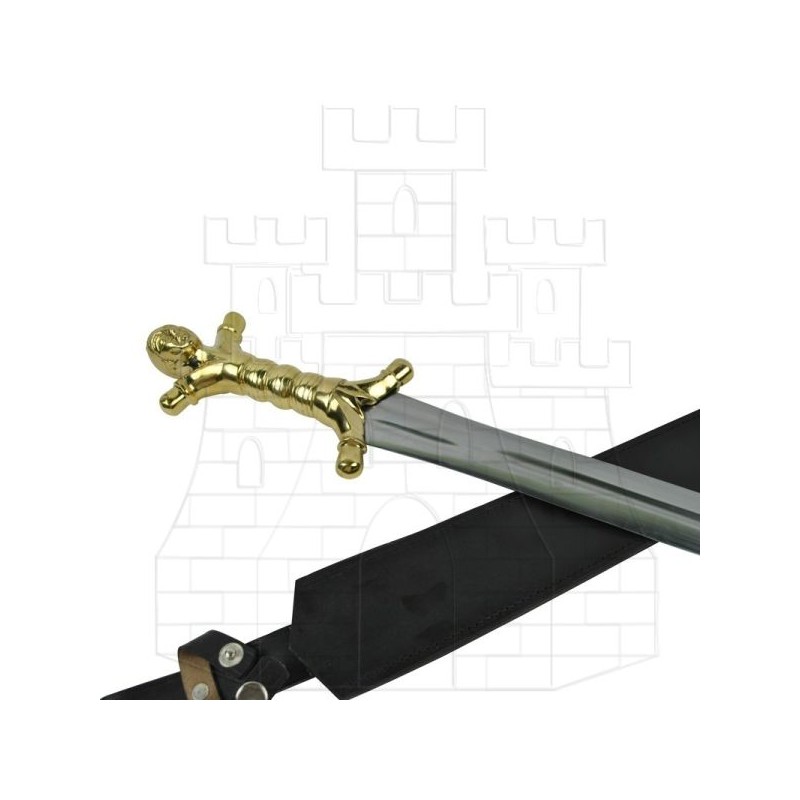 Keltský meč s pochvou. Vysokouhlíková čepel. Mosazný jílec. Kožená pochva.