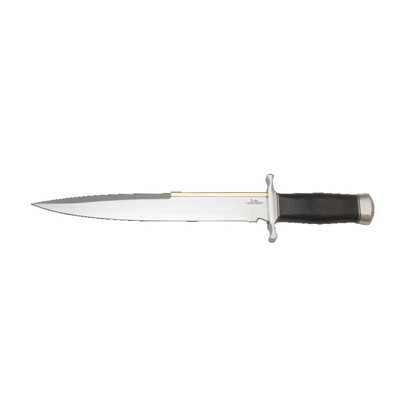 It offers a classic Arkansas toothpick style 11 7/8" stainless steel blade with mirror-polished finish and a solid brass back.