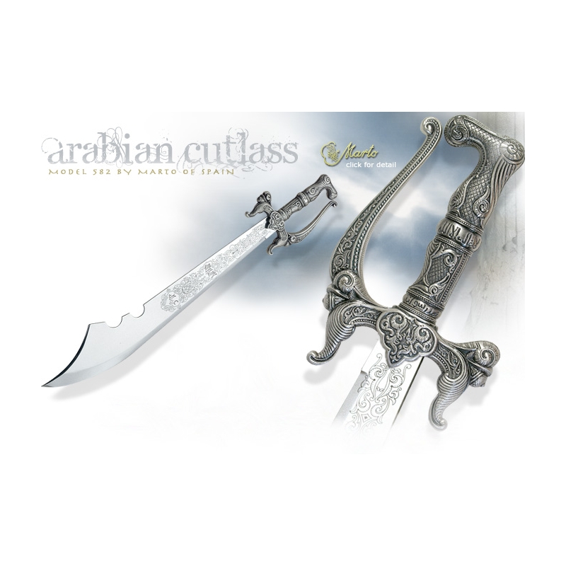 The Arabic Scimitar Cutlass Sword by Marto of Toledo Spain is a reproduction of a cutlass that can be found in the "Museo del Ejercito" in Madrid Spain. Its main characteristics are the crossward, which raises to the handle on one side and descends to the blade on the other side, and its wide curved blade. This wonderfully stylized cutlass is a reminder that Toledo Spain was an important center of sword production during these historical Arab Islamic periods. The 420 stainless steel blade measures 25" in length and 4-1/2" across at the widest point of its tip. Overall length of this beautifully detailed collectors cutlass is 32-1/4".