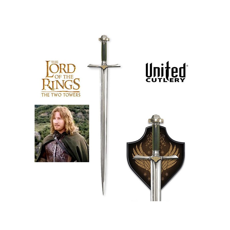 Meč Faramira, bratra Boromira s plaketou z Pána prstenů. Ocel. 98 cm délka. Dřevěná plaketa.