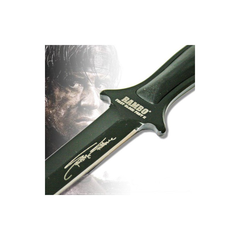 Nůž Rambo II Boot Knife. Podpis Sylvester Stallone. Nůž z druhého filmu Rambo, Vietnam. Délka: 29cm, kožené pouzdro.
