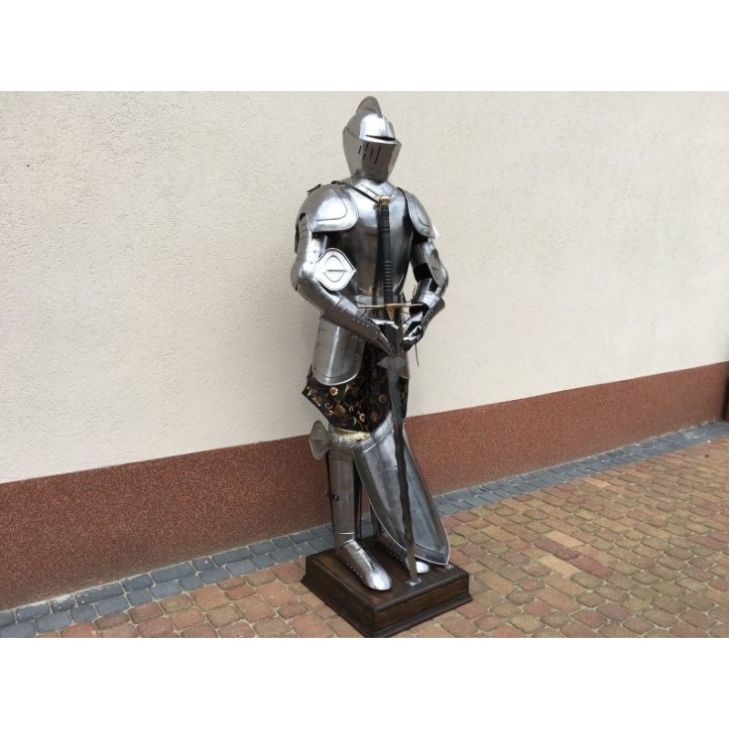 Rytířská zbroj. Kompletní rytířské brnění s obouručním mečem a štítem plus podstavec. Dekorativní ocelová zbroj rytíře ze středověku