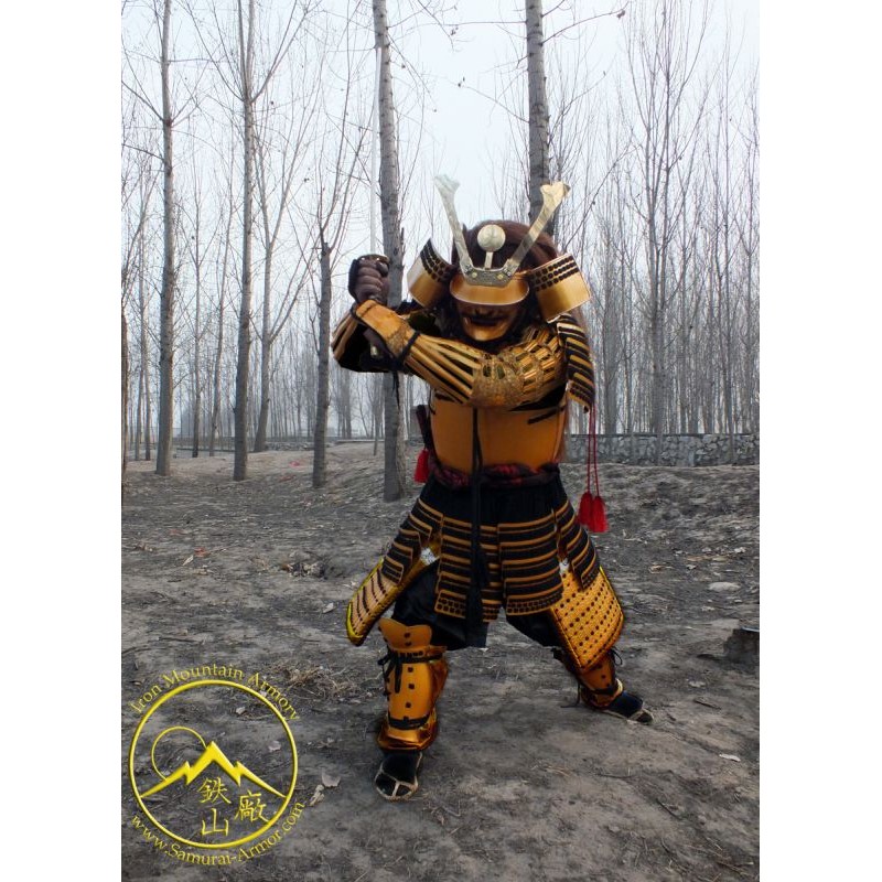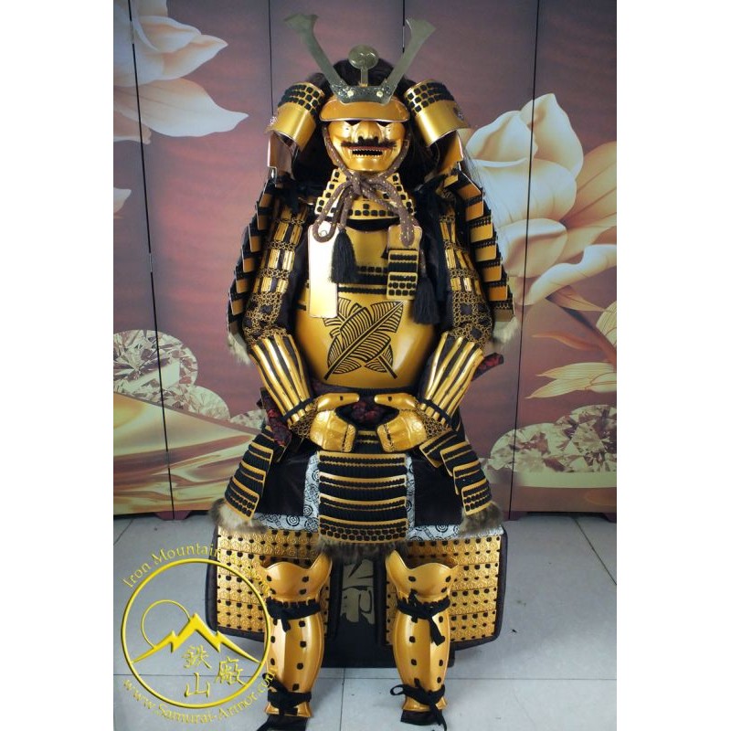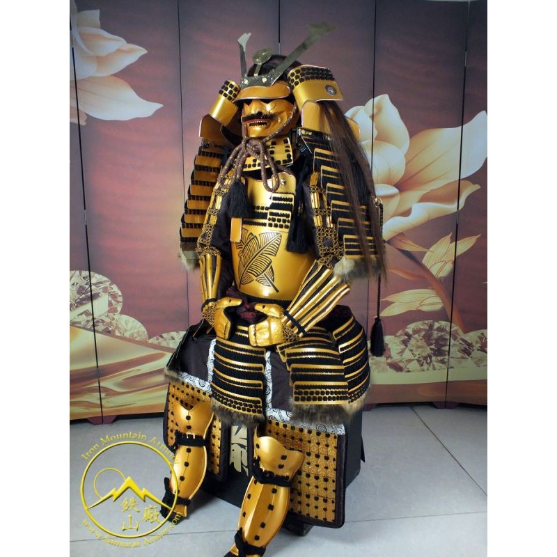 Zlaté císařské samurajské brnění. Japonská zbroj vyrobená pro císaře v období Edo. Luxusní samurajské brnění, které je nositelné a plně funkční.