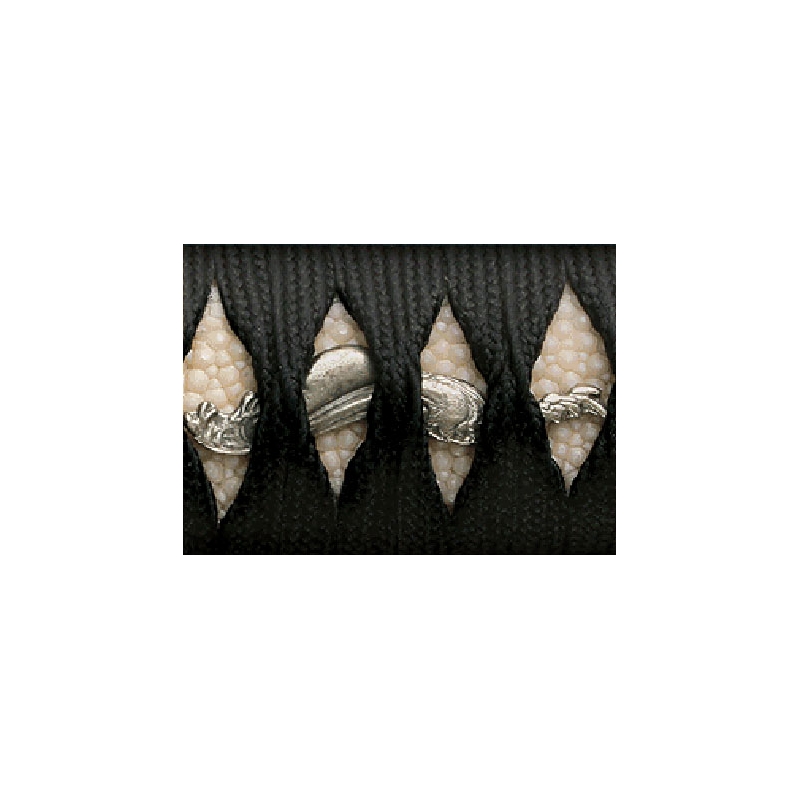 The Habaki (blade collar) is hand made out of polished brass and each hilt is covered in Save (ray skin) and tightly wrapped in the traditional style with black cord. A beautiful brass Menuki (small ornamental sculpture inserted between the ray skin and the cord wrappings on the handle) enhances the sword's aesthetic appearance and makes for a sword that is as traditional looking as it possibly can.