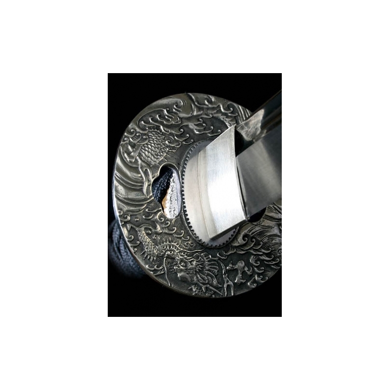 The Habaki (blade collar) is hand made out of polished brass and each hilt is covered in Save (ray skin) and tightly wrapped in the traditional style with black cord. A beautiful brass Menuki (small ornamental sculpture inserted between the ray skin and the cord wrappings on the handle) enhances the sword's aesthetic appearance and makes for a sword that is as traditional looking as it possibly can.