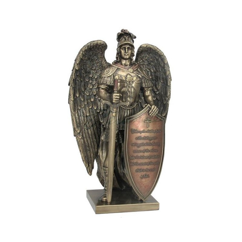 Archanděl Michael soška - meč a štít s nápisem. Symbol boží moci. Soška 35 cm. Resin. Bronzový povrch.