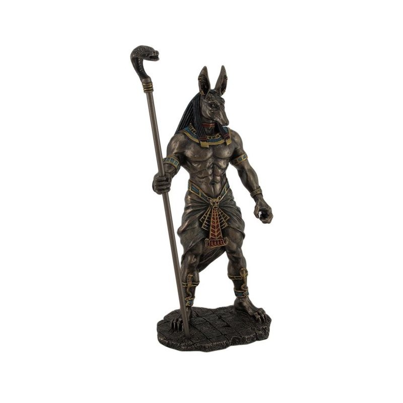 Anubis - egyptský bůh smrti v podobě šakala s holí ve tvaru kobry.
