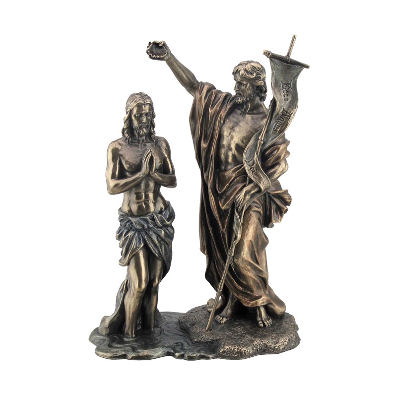 Jan Křtitel a Ježíš soška. Křest Ježíše v řece Jordán. Křesťanská soška resin s bronz nátěrem. 30 cm.