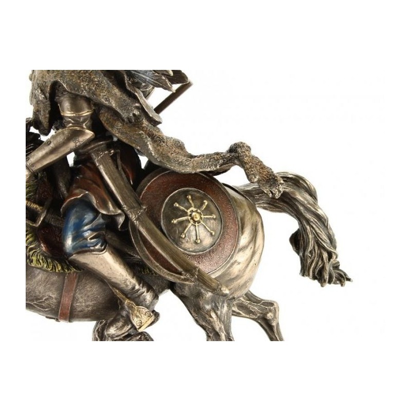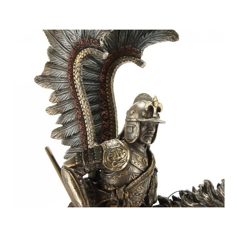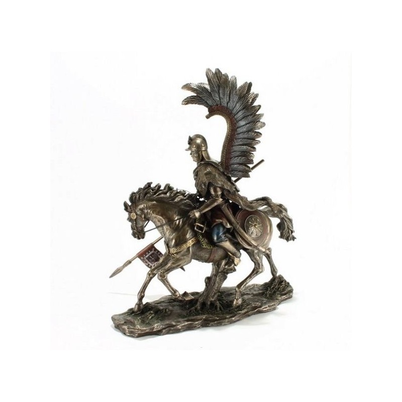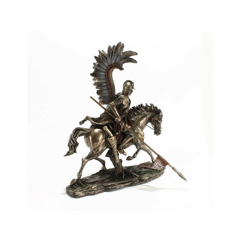 Soška Polský Husar. Husar na koni s kopím, šavlí, pistolí a se štítem a křídly. Elitní kavalérie. 32 cm. Resin s bronzovým nátěrem.