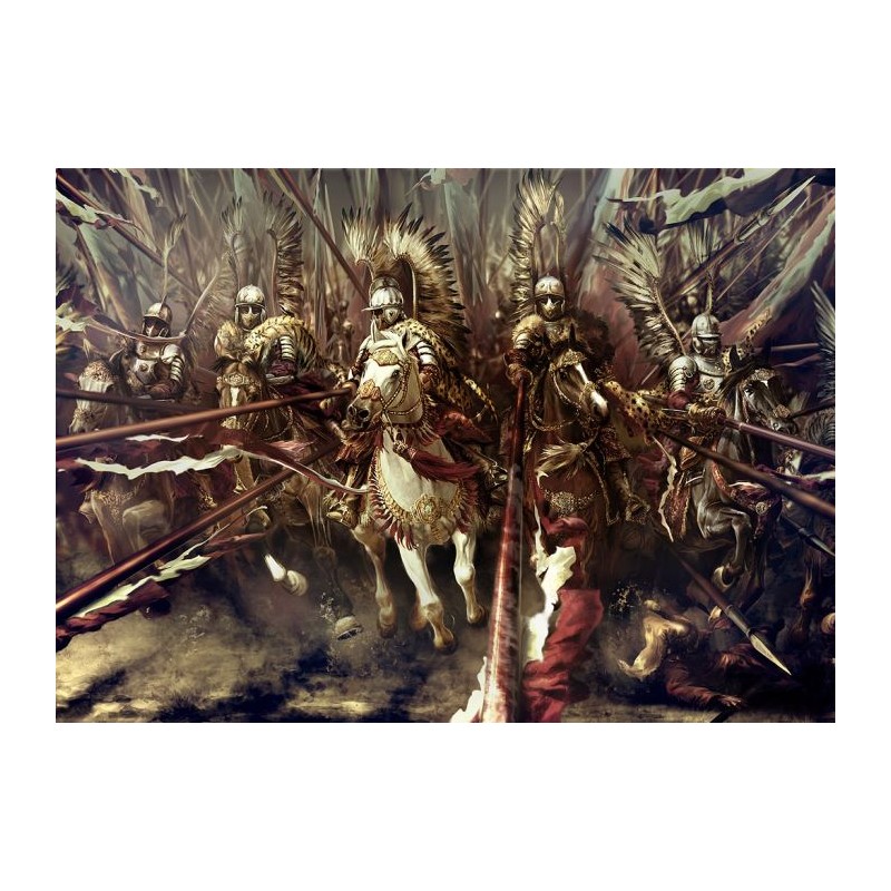 Husar na koni s kopím, šavlí, pistolí a se štítem as křídly.