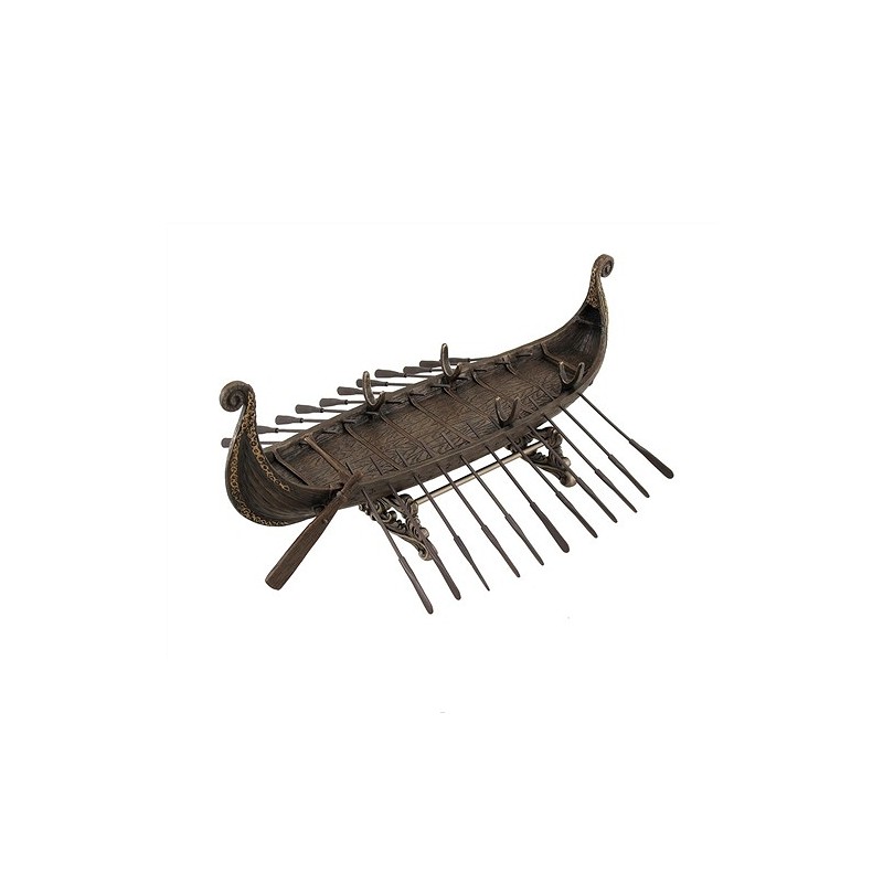 Vikingský Drakkar. Dračí loď používaná vikingy během jejich nájezdů (8.-11. století). Luxusní detailní model lodě s vesly. 30 cm. Resin. Bronzový nátěr.
