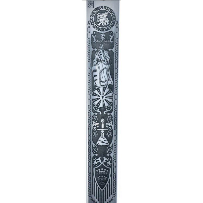 Symboly na čepeli: Král Artuš, kulatý stůl, svatý grál, erb Camelotu, Excalibur v kameni.