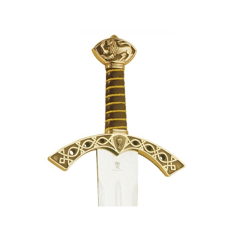 99 cm dlouhý, dekorativní meč. Nerez ocel, kožené držadlo, hlavice s plastikou lva, svatý grál zdobí záštitu.