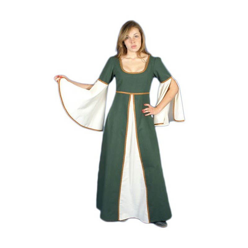 Středověké Šaty Munia. Zelenobílé šaty, zlaté lemování, volné rukávy. Kostým pro karnevaly, historické akce, reenaktment a LARP. Bavlna.