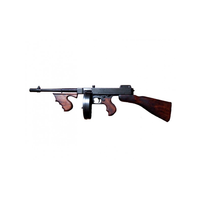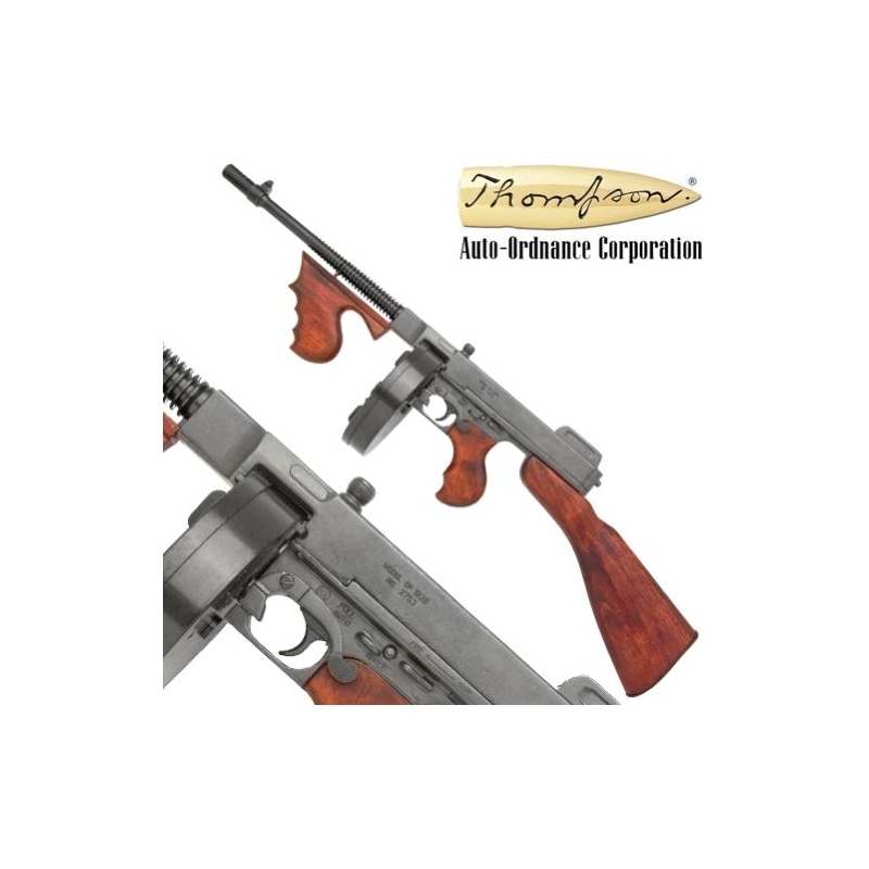 Samopal Thompson 1928 Bubnový zásobník. Autentická replika zbraně 2. světová válka a prohibice, zbraň Mafie. Mechanismus je pohyblivý.
