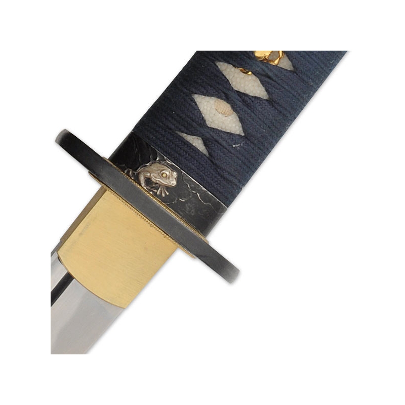 Hanwei Kaeru Wakizashi SH2468. Funkční samurajský meč, doplněk setu ke Kaeru kataně SH2467. Překládaná prášková ocel, motiv žáby, tmavě modrozelná rukojeť.