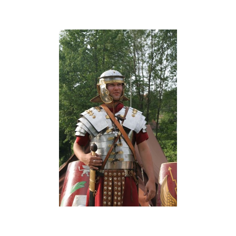 Lorica Segmentata, Římská Zbroj. Zbroj římských legionářů. Životní velikost. Nositelná, funkční. Ocel, mosaz a kůže. Další římské zbroje: Lorica hamata (kroužková) a Lorica squamata (šupinová).